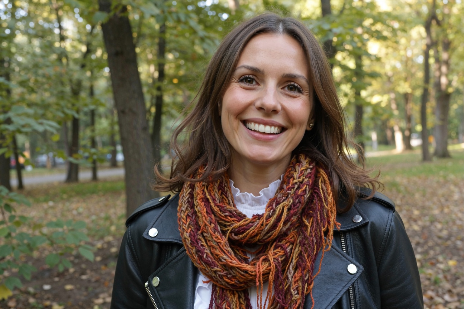 ? Location: Outdoors, in a park or wooded area | Enhanced Prompt: A realistic portrait of a Caucasian woman in her late 30s, featuring a prominent, genuine smile revealing white teeth, with warm brown eyes looking directly at the viewer. She wears a dark, slightly glossy leather jacket over a white ruffled blouse, accented by a thick, fringed scarf in burnt orange, rust, and brown tones. The scene is outdoors in a wooded park area, with blurred background trees creating a natural frame and soft, creamy bokeh. The lighting is natural late afternoon sunlight, creating a warm color tone and excellent clarity. This medium shot uses a rule of thirds composition, positioning her face slightly left of center, captured with an 85mm portrait lens effect, emphasizing shallow depth of field and sharp focus on her features. Photorealistic, high clarity, subtle texture. SHOT: