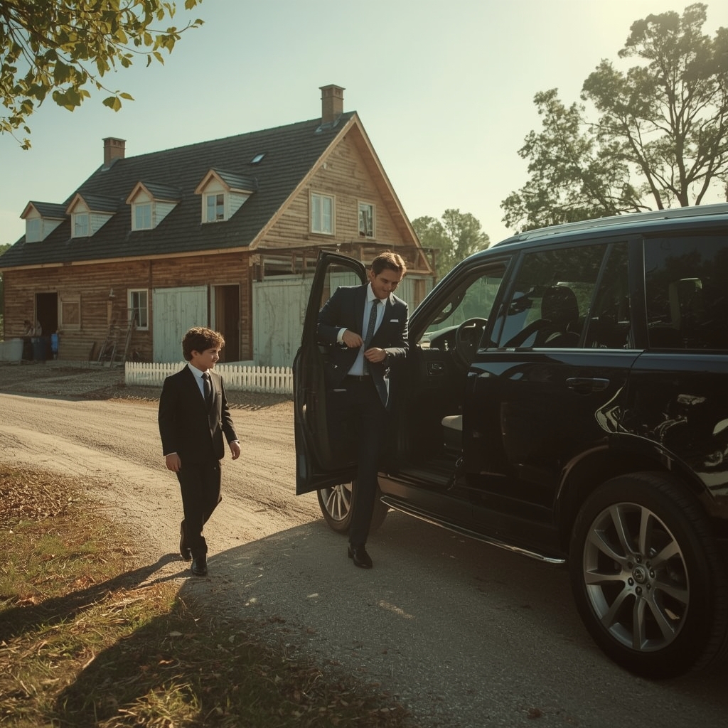 Возле строящегося коттеджа остановился крутой джип, из которого вышел крутой господин и мальчишка лет двенадцати.