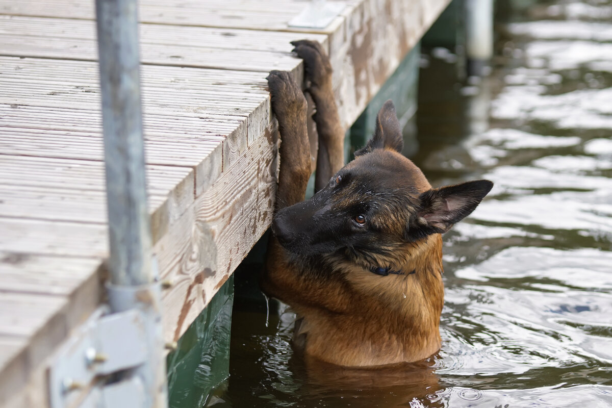 Наблюдая за тем, как малыш прыгает на краю пирса, собака почувствовала, что добром это не закончится.