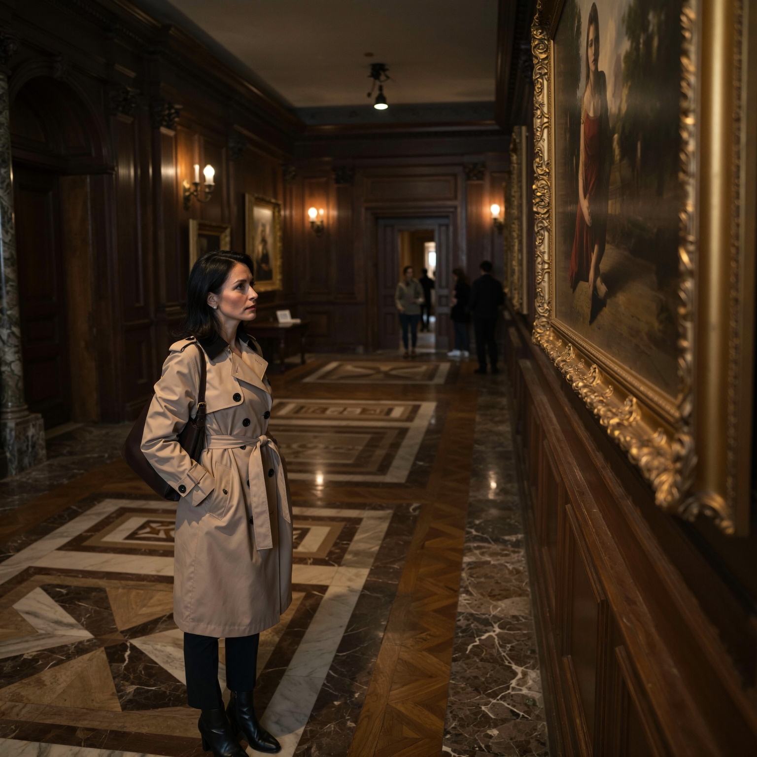 ? Time of Day: App | Enhanced Prompt: A realistic medium shot portrait of a woman in her late 40s, with a serious, contemplative expression, positioned slightly left of center and facing right, attentively gazing at a large, framed artwork. She has neat, dark, medium-length hair and is wearing a muted beige trench coat with a dark collar, dark trousers, and dark heeled ankle boots, a dark shoulder bag slung across her left shoulder. The scene is a grand, dimly lit indoor hallway, possibly a museum, featuring ornate moldings, dark wood paneling, and a patterned marble floor, where the architecture acts as leading lines. The lighting is low, dominated by warm artificial sources, creating a clean texture with minimal film grain. The composition utilizes a shallow depth of field (f/2.8), rendering the background figures and distant hallway elements into creamy, smooth bokeh, sharply isolating the subject and the foreground artwork. Photorealistic, cinematic. SHOT: