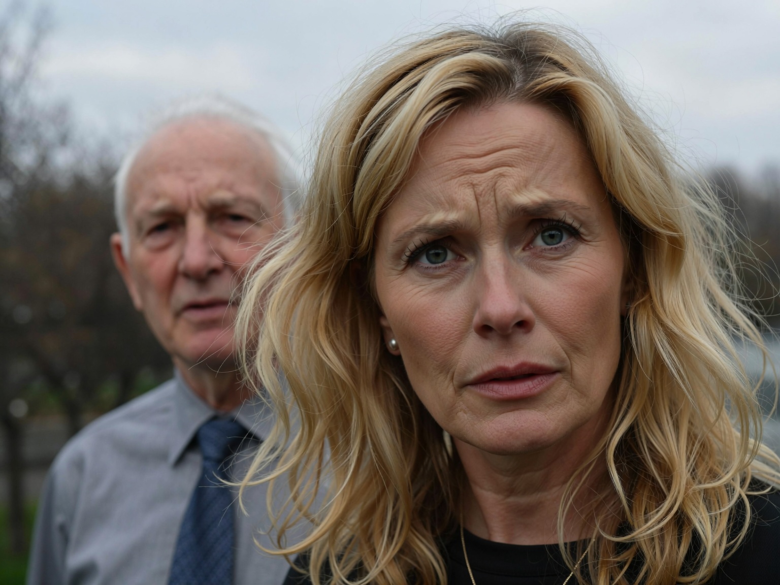 * Man: App | Enhanced Prompt: A photorealistic medium shot, tightly framed on two individuals, emphasizing a Caucasian woman in her early sixties in the foreground, positioned slightly off-center to the right, occupying 60% of the frame, while an older man is partially obscured behind and to her left in the background. The woman has fair skin with visible wrinkles, blonde, shoulder-length tousled hair, and wide, light-colored eyes conveying concern, her brow furrowed and lips pursed. The man is subtly visible, adding depth. The scene is illuminated by overcast or diffused artificial light, creating soft shadows and maintaining digital clarity with smooth transitions. Shot with an 85mm prime lens, the focus is critically sharp on the woman’s face, exhibiting a shallow depth of field with a pleasing bokeh effect isolating the primary subject. SHOT: