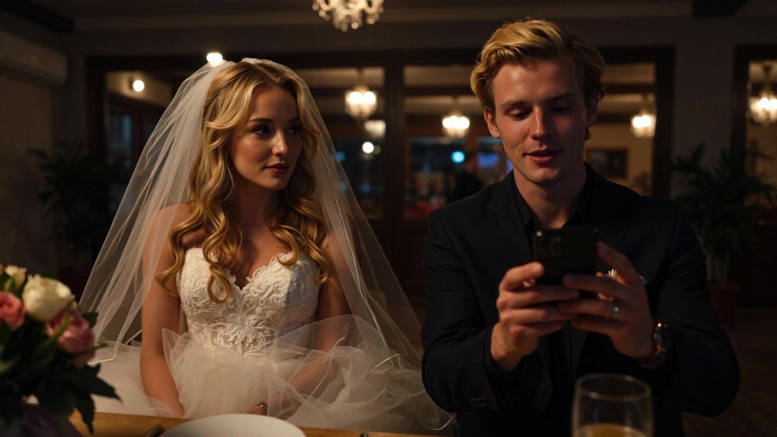 ? Wardrobe: The bride is wearing a traditional white wedding dress. The bodice appears to be lace with intricate detailing, and the skirt is full and voluminous, made of tulle or a similar light fabric. She is wearing a sheer white wedding veil that extends down her | Enhanced Prompt: A photorealistic medium shot of a newly married couple seated closely at a dimly lit reception table, framed slightly off-center for a dynamic balance. The bride, on the left, is a young woman with delicate features, fair skin, and long, wavy blonde hair beneath a sheer white veil, wearing an intricate lace bodice wedding dress with a voluminous tulle skirt, gazing contemplatively at the groom. The groom, on the right, is a young man with short, styled blonde hair and a light tan, holding a smartphone while looking engagedly at his bride. The scene is dominated by low, warm artificial lighting, creating a soft rim light effect and deep, smooth bokeh from distant background lights. The composition utilizes a moderate telephoto lens aesthetic with a very shallow depth of field (f/2.8), ensuring sharp focus on their faces and a pleasing, smooth falloff into the blurred background. The image exhibits clean texture and low noise levels. SHOT: