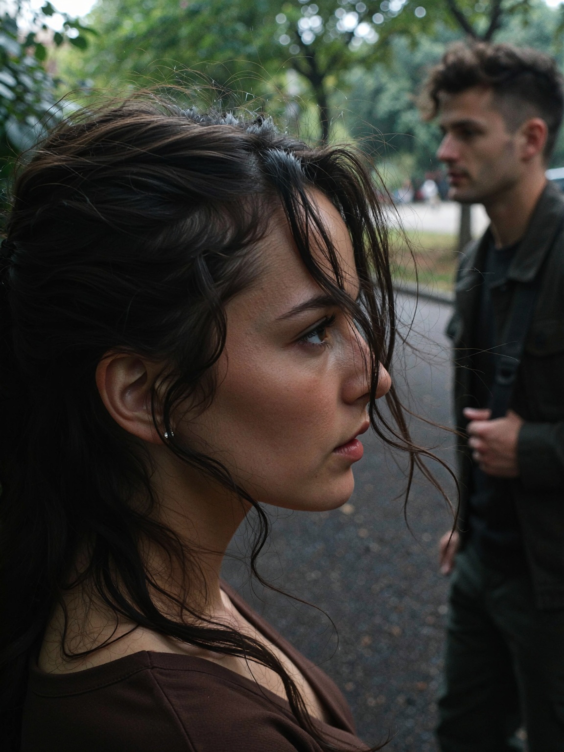 ? Description: The primary subject is a young adult female, appearing to be in her early to mid-20s. She has a slender build and a fair skin tone. Her hair is dark brown, medium length, and appears somewhat disheveled, falling across her face and obscuring her features. Her expression is not clearly visible due to the hair and angle, but her posture suggests a sense of movement or contemplation. The secondary subject is a young adult male, also appearing to be in his mid-20s, with a medium build. His facial features are blurred and indistinct | Enhanced Prompt: A realistic medium shot portrait of a young adult female in her early twenties, slender build with fair skin, positioned slightly off-center to the left. Her dark brown, medium-length hair is disheveled, falling across her face, suggesting a contemplative posture. In the background, positioned to the right and significantly out of focus, is a young adult male with a medium build, his features indistinct. The scene is an outdoor pathway or street under overcast, diffused natural light, creating a moody atmosphere. The aesthetic is gritty and vintage, characterized by moderate to heavy film grain and noticeable vignetting that darkens the corners. The composition utilizes a shallow depth of field (f/2.8-f/4) with creamy bokeh, smoothly isolating the foreground woman. Slight barrel distortion and minor chromatic aberration are present in the high-contrast edges. Photorealistic, high contrast lighting, film grain effect. SHOT: