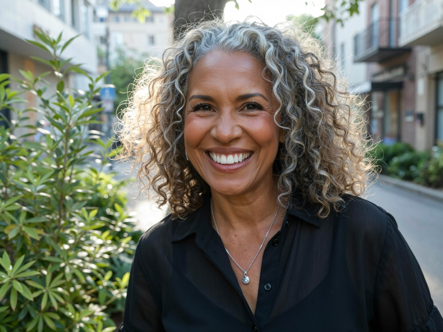 ? Grooming: Her hair is styled in a voluminous, natural curl. Her makeup appears subtle and natural, enhancing her features without being overtly noticeable. Her skin | Enhanced Prompt: A photorealistic medium shot of a middle-aged woman in her early sixties, positioned slightly off-center to the right following the rule of thirds, her warm olive skin tone beautifully rendered. Her face is the primary focal point, framed by a voluminous, curly mass of salt-and-pepper hair catching the bright daylight. She wears a black, lightweight, slightly sheer collared blouse, accented by a delicate silver pendant necklace. The scene is an outdoor urban setting during bright natural daylight, featuring lush green foliage in the foreground and a softly blurred urban street in the background, creating a creamy, smooth bokeh effect. The aesthetic is controlled by a shallow depth of field (f/2.8-f/4) using a 50mm-85mm prime lens, resulting in digital clarity, minimal noise, and sharp focus on her prominent, warm smile. SHOT: