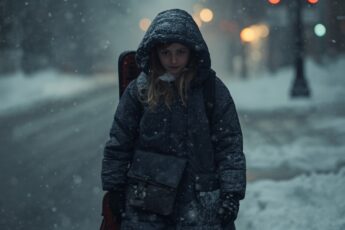 По заснеженной улице щуплая девчушка лет тринадцати