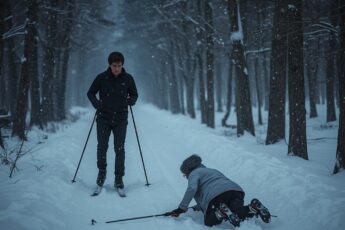 Алёша бежал рано утром на лыжах по лесопарку, и вдруг