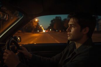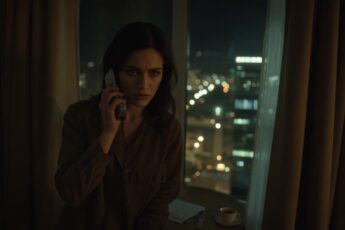 Елена вышла из автобуса. На фоне тёмного неба многоэтажные