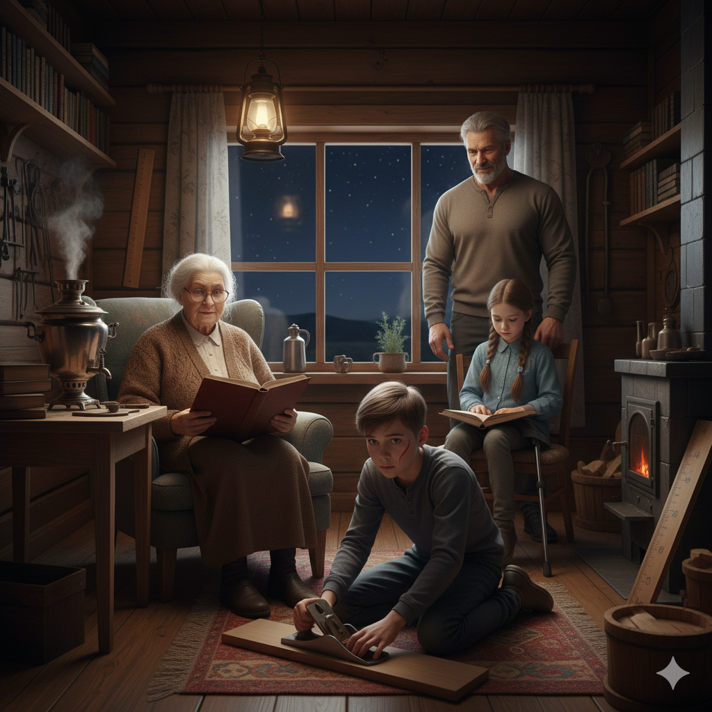 Василий смотрел, как Тамара Ильинична учит Лёшу держать рубанок, стуча его по рукам той самой деревянной линейкой. Как Катя читает вслух книжку, устроившись в кресле, — медленно, запинаясь, но читает.