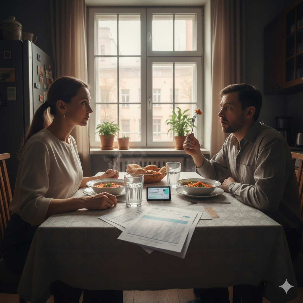 Он произнёс это тихо, будто проверял — не ослышался ли вчера, заглядывая в мобильный банк. Вилка в его руке замерла на полпути к тарелке. Я смотрела на неё, а не на него.