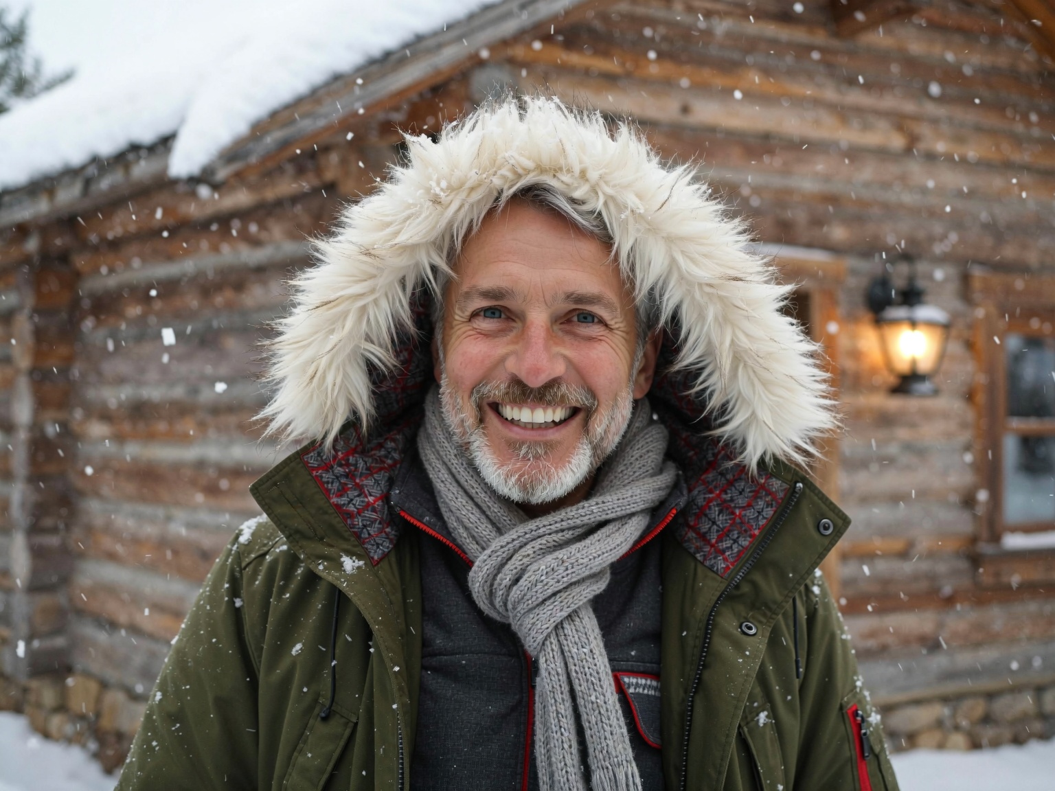 ? Wardrobe: He is wearing a thick, olive-green winter jacket with a prominent, fluffy white fur-lined hood. Underneath the jacket, a dark grey or black layer is visible, possibly a fleece or sweater, with a red and grey patterned trim around the neckline. A lighter grey knitted material, possibly a scarf or | Enhanced Prompt: A photorealistic medium close-up shot of a Caucasian male in his early sixties, featuring a broad, genuine smile that reveals white teeth and clear blue eyes conveying warmth and happiness. He has a medium build, fair skin with prominent wrinkles around his eyes, short salt-and-pepper hair, and a neatly trimmed grey beard. He is wearing a thick, olive-green winter jacket with a fluffy white fur-lined hood, revealing a dark grey layer underneath with red and grey patterned trim, and a lighter grey knitted scarf. The subject is positioned slightly off-center to the left, standing before a rustic log cabin under an overcast winter daylight sky, with heavy, frozen snowflakes falling around him. A warm, artificial glow emanates from a nearby lantern, creating soft edge light against the falling snow. The composition uses a shallow depth of field with smooth, creamy bokeh blurring the background elements. Clean texture, sharp focus on the eyes, high detail. SHOT: