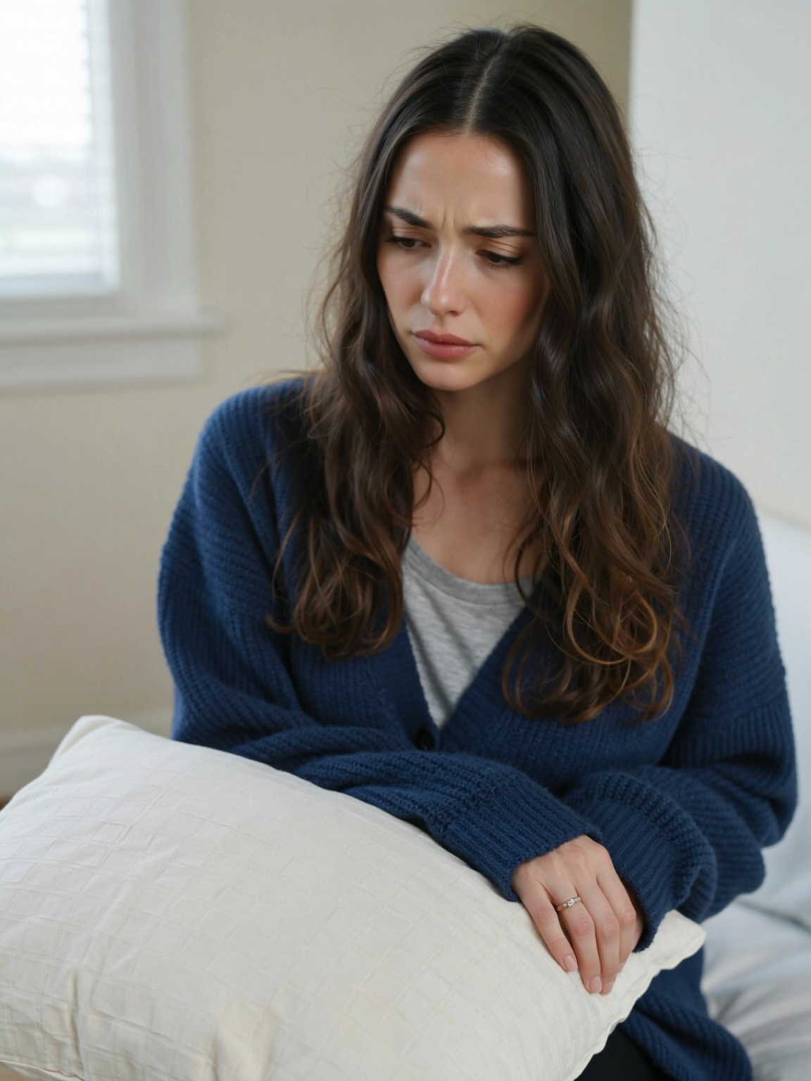 ? Location: Indoor | Enhanced Prompt: A photorealistic medium shot of a Caucasian female subject in her early thirties, featuring delicate facial features, a furrowed brow, and downcast eyes conveying deep contemplation or sadness. Her dark brown, long, wavy hair falls naturally around her shoulders. She wears an oversized, textured navy blue cardigan layered over a light grey t-shirt, with a simple ring visible on her left ring finger. The scene is an intimate indoor setting, where she is positioned slightly off-center to the right, leaning into a soft pillow resting in the foreground. The lighting is soft and diffused, mimicking a large softbox or window light, creating a clean, high-resolution capture with no discernible film grain. The composition adheres to the rule of thirds, utilizing a shallow depth of field (f/2.8) with smooth, creamy bokeh, sharply isolating her face and hand against the blurred background wall. Optically clean, hyperrealistic portrait. SHOT: