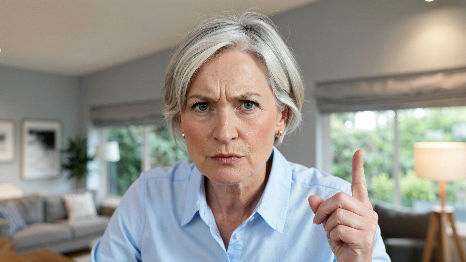 ? Location: An indoor residential setting, likely a living room. The background shows a modern apartment or house interior | Enhanced Prompt: A photorealistic medium close-up shot of a Caucasian woman in her early seventies, featuring prominent cheekbones and a stern expression with a slight frown, her light blue-green eyes directed intensely toward the viewer. Her short, layered grey hair is neatly styled. She wears a light blue, buttoned cotton collared shirt. Her right hand, with the index finger raised in a gesture of emphasis, occupies the lower right quadrant. The scene is a modern, blurred interior living room setting, providing significant negative space on the left for compositional balance. The lighting is a mix of soft ambient interior light and a directional key light, creating a smooth, high-clarity texture with minimal digital grain. The focus is sharp on her eyes, utilizing a shallow depth of field (f/2.8 to f/4) resulting in creamy, smooth bokeh. SHOT:
