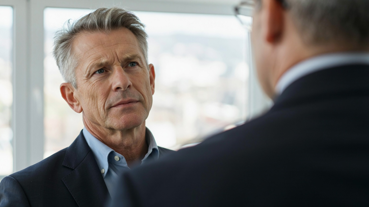 • Description: A Caucasian male, appearing to be in his late 50s to early 60s. He has a medium build and an average height impression. His skin tone is fair, with visible signs of aging such as fine lines and wrinkles around the eyes and forehead. His hair is short, neatly styled, and predominantly gray with some darker strands remaining, particularly at the temples. His facial features are well-defined, with a prominent nose and a slightly furrowed brow. His expression is one of concern, contemplation, or perhaps a touch of sadness, conveyed through his downcast eyes and the slight tension in his brow. His eyes appear to be blue or gray. His left hand is