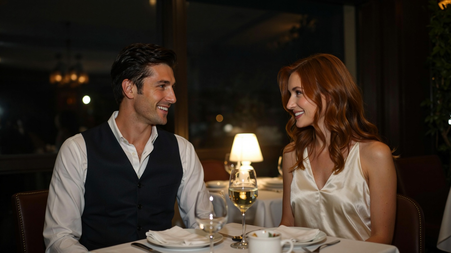 ? Grooming: Both subjects are well-groomed. The | Enhanced Prompt: A photorealistic medium shot of a Caucasian couple in their late twenties, centered and occupying the horizontal space, positioned slightly off-center for dynamic balance, seated at a dimly lit restaurant table that acts as a leading line. The man, with dark, neatly styled hair and a strong jawline, wears a dark fine wool vest over an unbuttoned white dress shirt, looking at the woman with a gentle smile. The slender woman has auburn, wavy hair falling past her shoulders, fair skin, and returns his gaze with a warm, engaging expression, wearing a sleeveless, cream-colored silk V-neck top with a subtle sheen. The scene is characterized by dim, evening restaurant ambiance, utilizing a key light that highlights their faces. The aesthetic employs a shallow depth of field (f/2.8 to f/4) achieved with a moderate focal length lens, resulting in creamy, smooth bokeh from ambient light sources in the softly blurred background. The image is optically clean with high clarity on the well-groomed subjects. SHOT:
