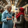 • Composition: Medium shot, slightly off-center framing with the woman on the right and the child on the left, creating a dynamic asymmetry. The subjects are positioned in the foreground, occupying the majority of the frame. The background is blurred, providing a soft contrast to the sharp focus on the subjects.