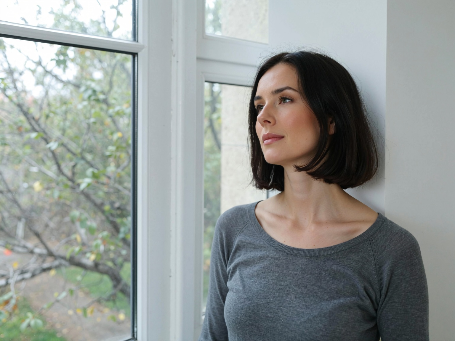 ? Wardrobe: She is wearing a long-sleeved, crew-neck top. The fabric appears to be a soft, matte knit, possibly a cotton or modal blend, in a muted slate grey color (#778899). The fit | Enhanced Prompt: A realistic medium shot portrait of a Caucasian woman in her late thirties to early forties, possessing a fair complexion and delicate facial features including a prominent nose and defined cheekbones. Her dark brown, chin-length bob haircut is smooth and slightly wavy. Her expression is deeply contemplative and serene, with her eyes closed and her head tilted slightly upwards. She is wearing a long-sleeved, crew-neck top made of a soft, matte knit fabric in a muted slate grey color. The scene is indoors, positioned slightly off-center to the right adhering to the rule of thirds, with a large window frame acting as a strong compositional element bisecting the scene. Through the window, softly blurred trees and foliage create a pleasing bokeh effect, isolating the subject. The lighting is diffused, natural light from the overcast day, suggesting a moderate ISO and an aperture around f/4, resulting in clean digital clarity with no visible film grain or lens artifacts. A moderate focal length lens provides natural perspective. SHOT: