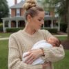 • Wardrobe: She is wearing a long-sleeved, crew-neck top. The fabric appears to be a soft, matte knit, possibly a cotton or modal blend, in a muted slate grey color (#778899). The fit