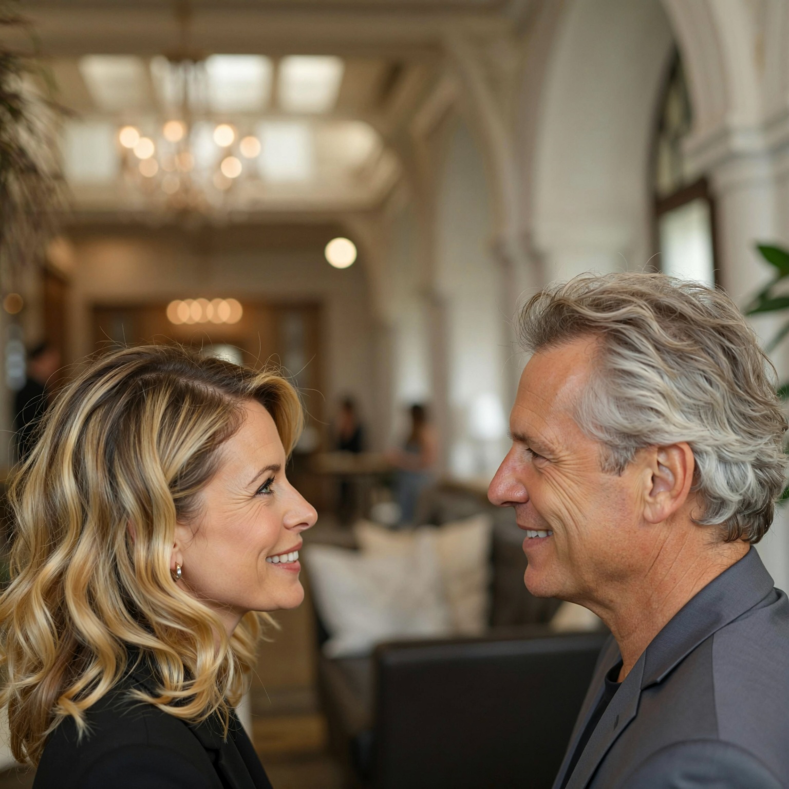 * Man: Appears to be in his late 50s to early 60s. Caucasian ethnicity. Medium build. Fair skin tone with some sun exposure. Salt-and-pepper hair, medium length, styled with texture and volume, swept back from his forehead | Enhanced Prompt: A photorealistic medium shot capturing the upper torsos and heads of two individuals in profile, a woman on the left and a man on the right, their gazes locked in a moment of connection, forming a strong diagonal line across the frame, slightly off-center to the right. The woman, late fifties, Caucasian with fair skin and delicate features, has shoulder-length, wavy blonde hair and a warm, engaging expression directed toward the man. The man, also late fifties, Caucasian, has fair, sun-exposed skin and textured, salt-and-pepper hair swept back. They are situated in an ambiently lit indoor setting, perhaps a sophisticated lounge. The aesthetic control emphasizes a shallow depth of field (f/2.8 to f/4), achieved with a high-quality 85mm prime lens, resulting in creamy, smooth bokeh that softly blurs the background architectural elements and indistinct figures into orbs of light. The image is characterized by high clarity, smooth texture, and no visible grain, utilizing soft fill light to maintain sharpness on their faces. SHOT: