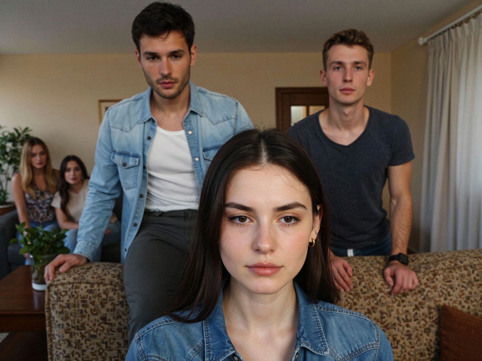 * Man (Left Background): Appears to be a young adult, likely 25-35 years old, with a medium build. He has fair skin and short, dark brown hair. He is wearing a light blue denim shirt over a white | Enhanced Prompt: A realistic medium shot, centered on a slender young woman aged 18-25 in the foreground, seated on a sofa with fair skin and straight, dark brown hair parted in the center, displaying a neutral, slightly sad expression with dark eyes looking downwards. She is flanked by two young adult men (25-35) standing behind her?one on the left wearing a light blue denim shirt over a white undershirt, and another on the right?while a fourth woman is seated further back on the left, forming a tight triangular composition grounded by the sofa and coffee table. The scene is illuminated by diffused indoor ambient light, suggesting an estimated ISO of 400-800, captured with a moderate focal length lens (50mm-85mm equivalent) at approximately f/4.0, ensuring the foreground subject is sharp while the background figures exhibit a creamy, unobtrusive bokeh. Low to moderate, fine film grain adds a naturalistic texture to this clean, realistic portrait. SHOT: