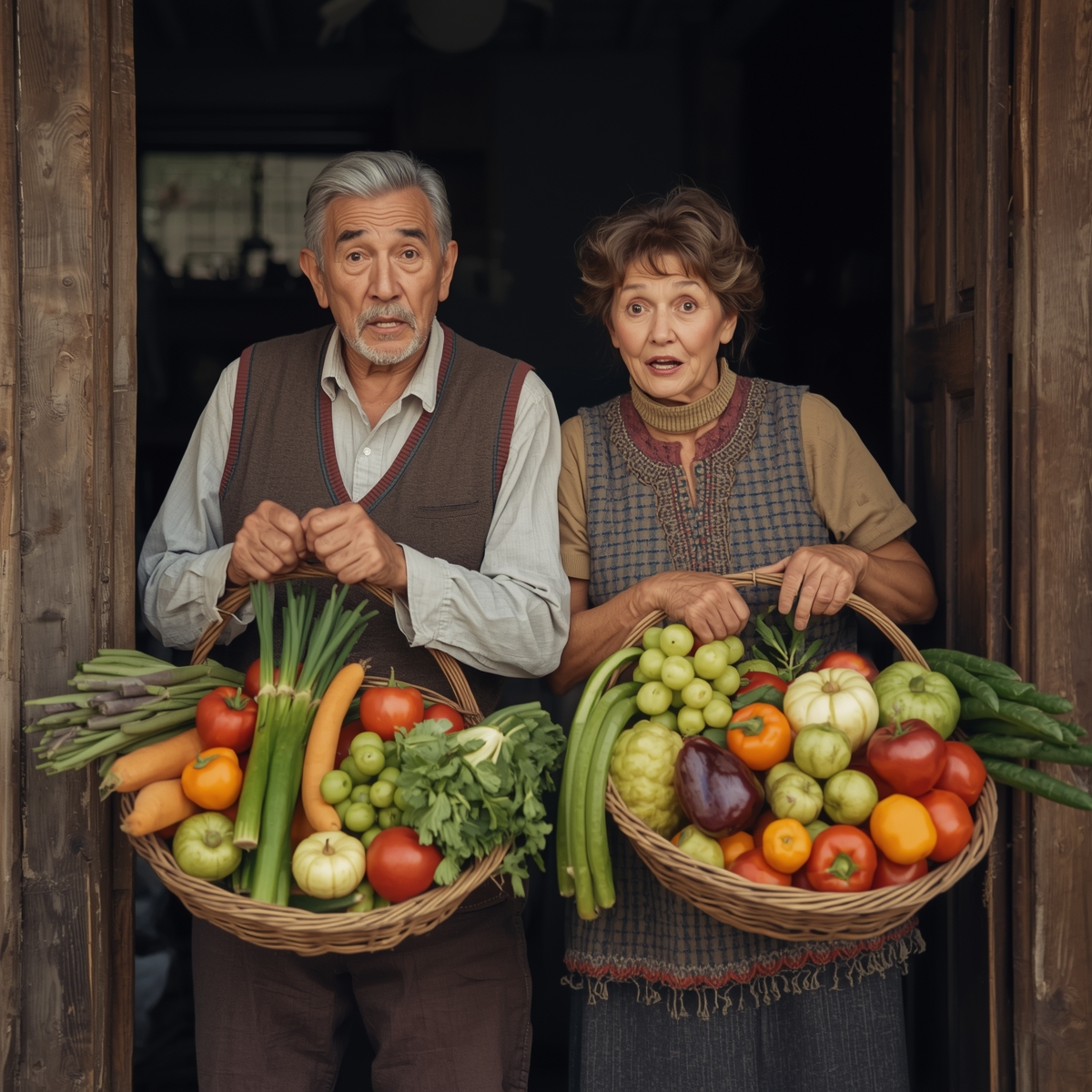 Незваные гости держали в руках корзины с огурцами и помидорами, а также мешки с картошкой и морковью, — вероятно, гостинцы для Вени.