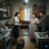 Костя скрывается в спальне и оттуда слышится грохот. Жужа наваливается плечом на входную дверь.