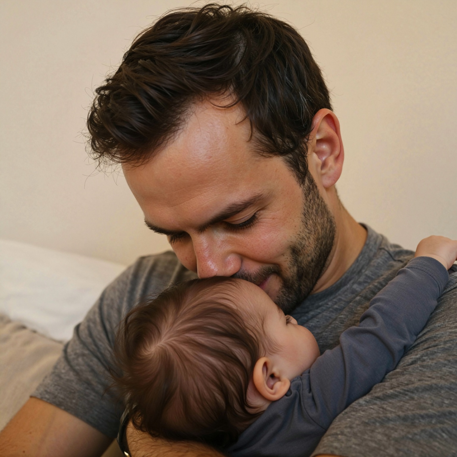 ? Composition: Medium shot, tightly framed on the upper bodies of a man and a baby. The man is positioned on the left side of the frame, cradling the baby on his right side. The baby is slightly off-center to the right, creating a gentle asymmetry. The man’s head is bowed, resting his forehead against the baby’s head, creating a strong emotional connection and a sense of intimacy. The background is out of focus, providing a soft contrast to the sharp subjects.