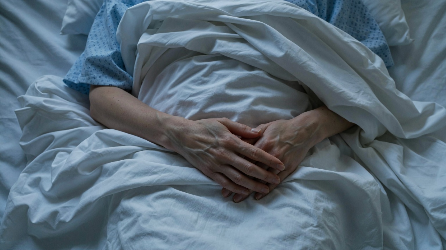 • Location: Indoor, strongly suggestive of a hospital room or a similar care setting due to the white bedding and the overall subdued, sterile