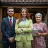 ? Composition: Medium shot, framing three individuals from the chest up. The woman on the left is positioned in the foreground, slightly off-center to the left, leaning forward. The man is in the mid-ground, centered behind her. The older woman is in the mid-ground to the right, slightly forward of the man. The composition is balanced by the placement of the three subjects, creating a triangular arrangement. The doorway behind the man acts as a subtle leading line, drawing the eye into the scene.