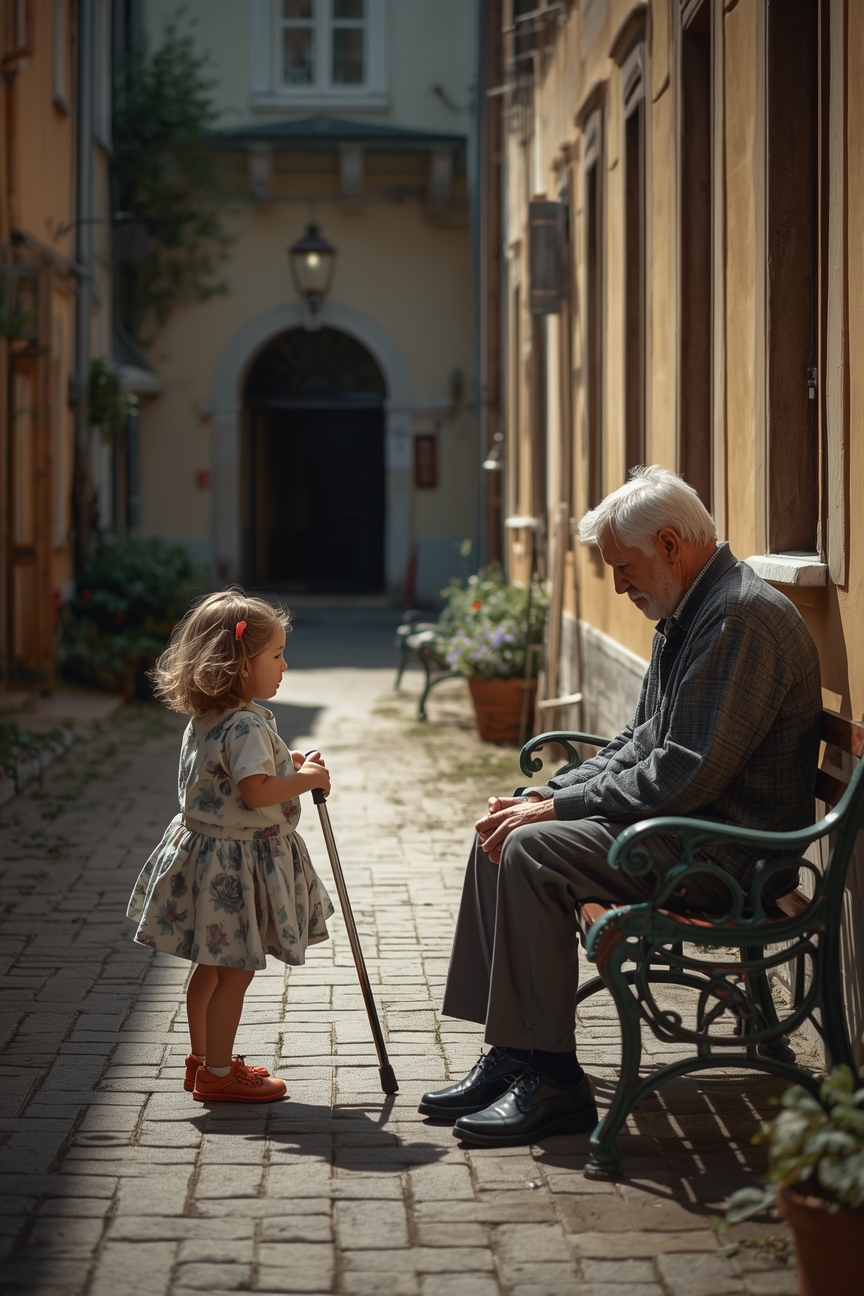 Малышка Алёнка, четырёхлетняя девочка, рассматривала «новенького», недавно появившегося в их дворе. Это был седой пенсионер, сидевший на скамейке. В руках у него была трость, на которую он опирался, как волшебник из сказки.