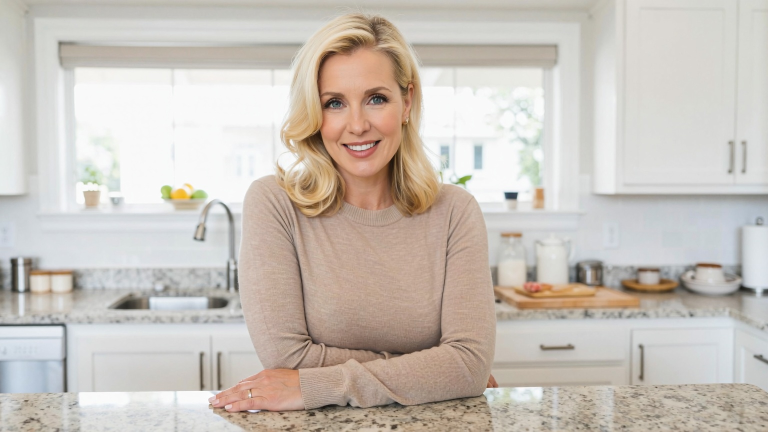 ? Grooming: Her hair is neatly styled. Makeup appears natural and subtle, enhancing her features without being overt. | Enhanced Prompt: A photorealistic medium shot of a Caucasian woman in her early fifties, featuring a fair complexion, shoulder-length blonde hair styled in soft waves with a side part, and a gentle smile engaging in direct eye contact. She is wearing a long-sleeved, crew-neck sweater in a light beige or taupe fine-knit material, with her arms resting on a kitchen countertop, anchoring the composition. The scene is a brightly and evenly lit interior kitchen space, where the background extends symmetrically, balanced by the centered framing slightly weighted to the right per the rule of thirds. The aesthetic control utilizes a moderate depth of field (f/2.8-f/4), keeping the subject sharply focused with creamy, smooth bokeh in the background, captured with a slight wide-angle lens effect for subtle perspective exaggeration. The image exhibits very low film grain, high clarity, and clean optics, creating a professional, elegant look. Stylization: Photorealistic, high clarity. SHOT: