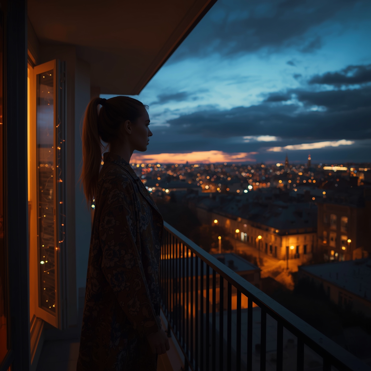 Вечер опустился на город, окутывая улицы мягким сумеречным светом. Алла вышла на просторный балкон их квартиры. Отсюда открывался вид на оживлённые городские улицы – люди спешили по своим делам, витрины магазинов переливались разноцветными огнями, машины проносились мимо, оставляя за собой светящиеся следы фар. Но всё это великолепие не могло отвлечь Аллу от тревожных мыслей.