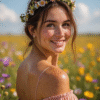• Wardrobe: She is wearing a light beige, wide-brimmed straw hat with a simple ribbon band. Beneath the hat, she has on a light blue collared shirt, buttoned up. Over the shirt, she wears a textured, light brown or taupe blazer with a subtle checkered pattern, featuring notched lapels and two buttons. Her trousers are a matching