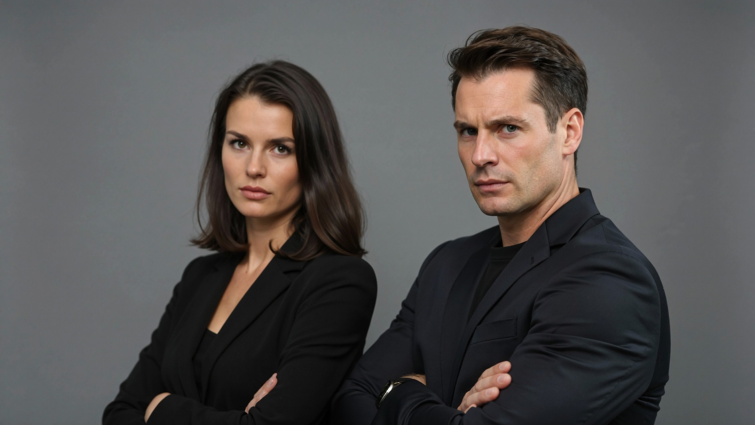 ? Wardrobe: The | Enhanced Prompt: A photorealistic medium shot of two individuals, a woman on the left and a man on the right, framed from the chest up, positioned slightly off-center to create a balanced, non-symmetrical composition. The woman, late thirties, has fair skin and straight, dark brown, shoulder-length hair, wearing a tailored black blazer, her arms crossed with a serious, unsmiling expression directed intently at the viewer. The man, also late thirties, with a lean build and fair skin, has neatly styled short dark brown hair, also wearing a dark blazer with his arms crossed, his stern expression conveying intensity towards the viewer. The scene is a minimalist studio environment with a smooth, softly blurred, neutral grey background, isolating the subjects. The aesthetic control features sharp focus on their faces, achieved with a moderate focal length lens (around 85mm) yielding a shallow depth of field with creamy, smooth bokeh. The lighting is controlled and professional, utilizing soft key light to ensure excellent detail rendition and low noise, resulting in a clean, high-clarity image with minimal vignetting. Stylization: hyperrealistic, high clarity digital portrait. SHOT: