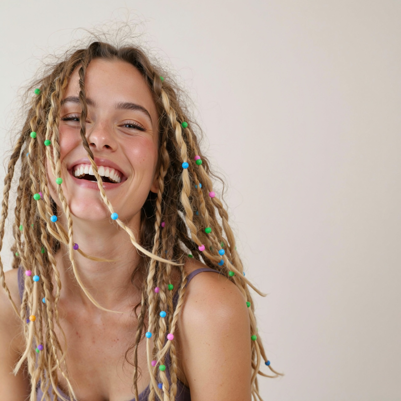 ? Description: A young adult female, appearing to be in her early to mid-twenties. Her ethnicity is Caucasian, with a fair to medium skin tone that shows subtle variations in color and texture, indicative of realistic rendering. She has a medium build, with a visible collarbone and shoulder suggesting a lean physique. Her hair is a light brown or dirty blonde, styled in numerous dreadlocks of varying thickness, some adorned with small, colorful beads (green, blue, possibly pink). Her facial features include a prominent nose, a wide, genuine smile revealing teeth, and closed eyes, suggesting laughter or deep contentment. Her expression is joyful | Enhanced Prompt: Subject (Description) + Scene (Description) + Aesthetic Control + Stylization