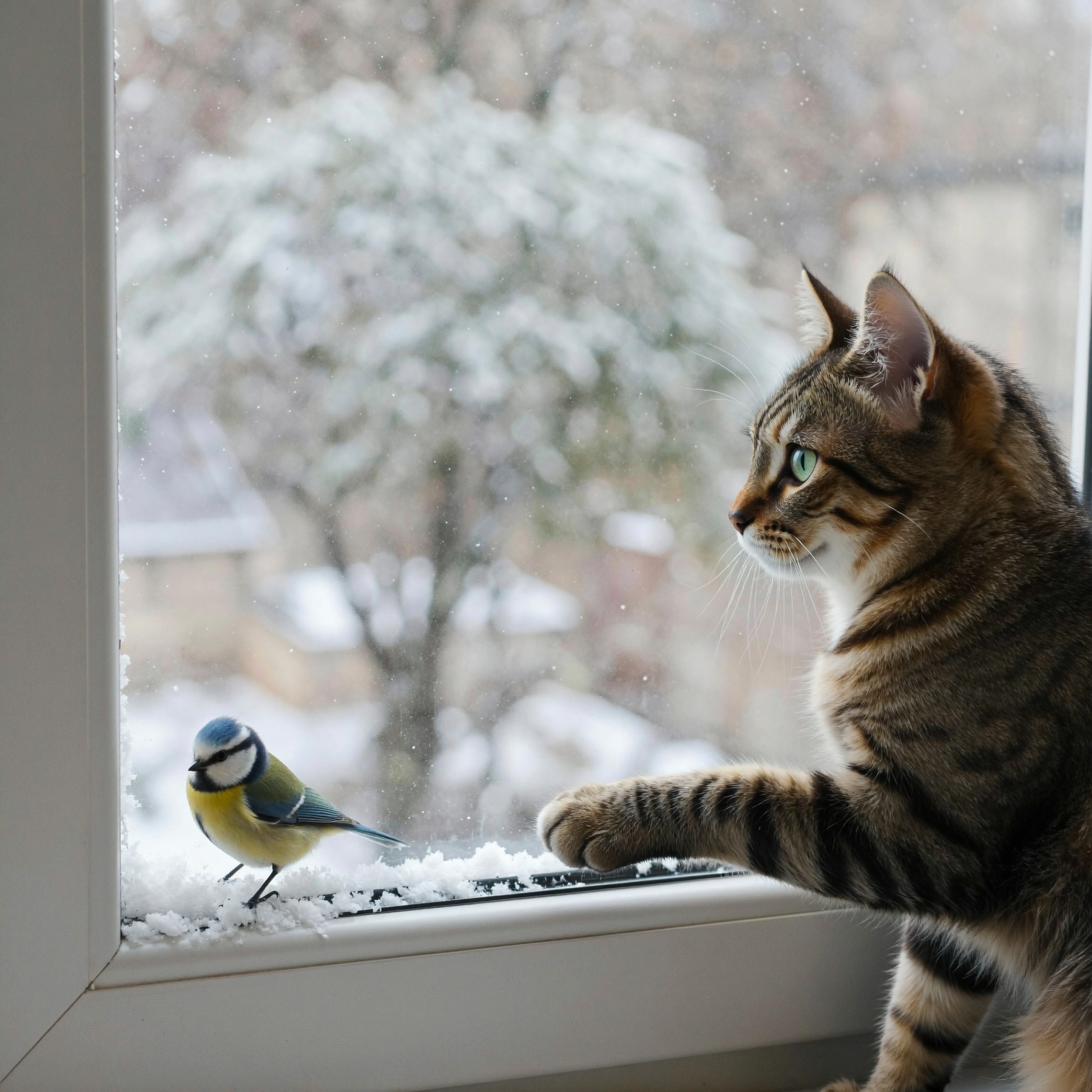 ? Location: Indoor, likely a residential setting, viewed through a window. The interior is suggested by the window sill and the cat’s presence. The exterior is a | Enhanced Prompt: A photorealistic medium shot capturing a domestic grey tabby cat, adult with distinct dark stripes and alert light green eyes, intently focused on a small blue tit perched delicately on a thin layer of frost outside. The cat’s paw is subtly extended towards the bird, creating a visual line of interaction. The scene is framed through a window, where the window frame acts as a strong horizontal and vertical element, adhering to the rule of thirds with the subjects positioned slightly off-center to the right. The exterior shows a softly blurred winter scene. The lighting is natural daylight from the window, resulting in a smooth, clean texture with very low film grain. The focus is sharp on the cat’s face and the bird, utilizing a moderate depth of field with smooth, creamy bokeh separating the subjects from the softly blurred window sill and background. Standard lens effect, high detail, hyperrealistic. SHOT:
