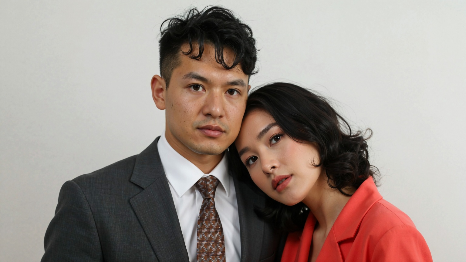 ? Wardrobe: The man is wearing a dark charcoal grey suit jacket over a crisp white dress shirt and a patterned tie in shades of brown and gold. The tie has a subtle, intricate pattern. The woman is wearing a bright coral red jacket or dress with | Enhanced Prompt: A photorealistic medium shot of a young man and woman, both in their early twenties, positioned centrally in a roughly symmetrical composition. The man, with a medium build and dark hair, wears a dark charcoal grey suit jacket over a crisp white shirt and a patterned brown and gold tie, his expression serious and direct. The woman, slender with shoulder-length dark hair in soft waves, leans into him, wearing a bright coral red jacket, her expression somber and contemplative. The scene is illuminated by soft, diffused studio lighting, creating a clean aesthetic with very fine, almost imperceptible film grain. The moderate depth of field renders the couple in sharp focus against a softly blurred background with creamy bokeh. The optics are sharp centrally with minimal vignetting, captured with a slight barrel distortion suggesting a wider lens. SHOT: