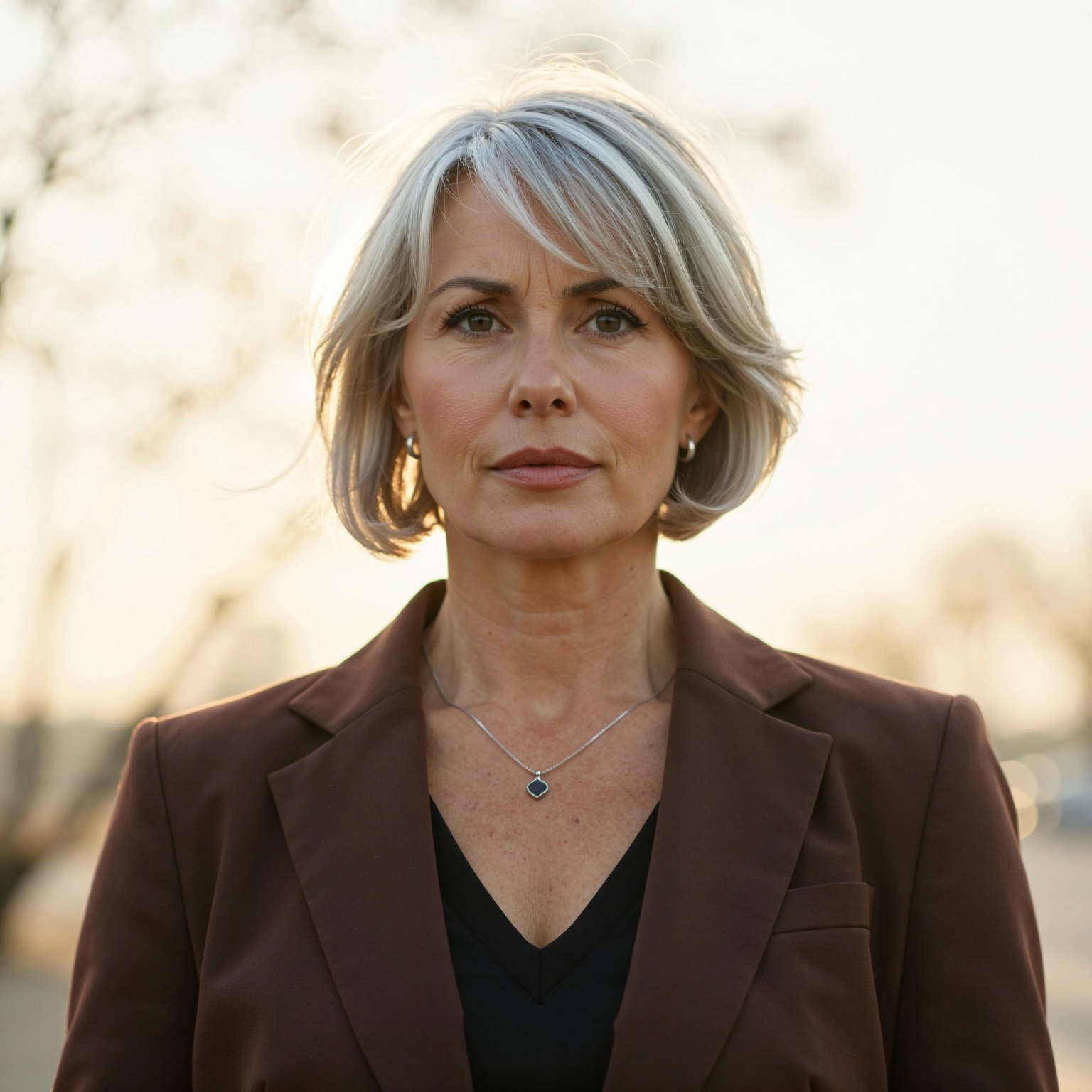 ? Description: A Caucasian woman, appearing to be in her late 50s to early 60s. She has a slender to average build and an estimated height of 5’5″ to 5’7″. Her skin tone is fair with visible fine lines around the eyes and neck, indicative of age. Her hair is short, layered, and styled away from her face, with a mix of silver and dark grey strands. Her facial features are sharp, with high cheekbones and a determined expression. Her eyes are a medium brown and appear focused.