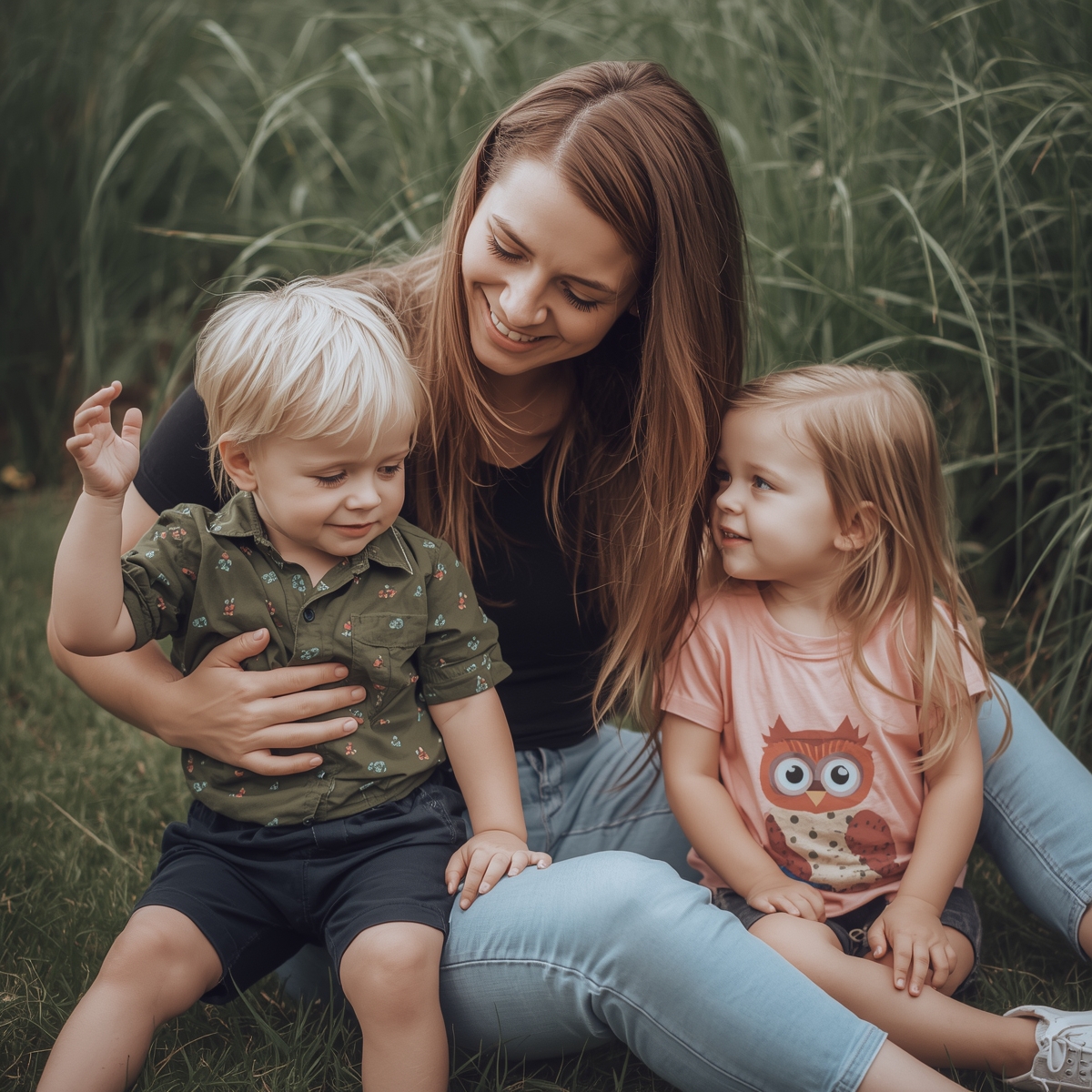 Наташа сидела прямо на траве и на её руках были двое, мальчик и девочка, похоже двойняшки.