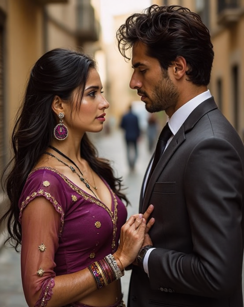 Перед ним стояла цыганка. Её длинная разноцветная юбка развевалась на ветру, тёмные глаза были подведены чёрным кайлом, на шее и руках сверкало золото, а голову покрывал яркий платок.