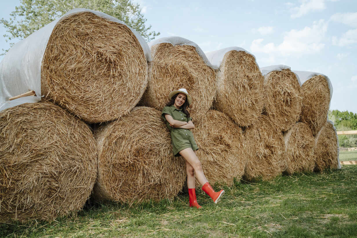 Smiling young farmer with arms crossed leaning on haystacks at farm