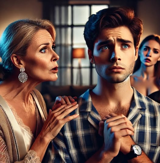 * Older Woman: App | Enhanced Prompt: A photorealistic medium shot, tightly framed on three individuals to convey interpersonal drama. The primary subject, a young man aged 18-25 with fair skin, dark tousled hair, and wide, anxious bright blue eyes, is positioned slightly off-center to the right in the foreground, his expression showing distress and pleading with furrowed brows and a slightly open mouth. To his left, an older woman is seen in profile, angled towards him with a stern, unyielding expression. A third, younger woman is visible in the background, slightly out of focus to the right. The scene is dimly lit, suggesting an indoor evening setting, utilizing controlled artificial lighting to achieve sharp detail on the main subjects, mimicking an ISO of 400-800 with digital clarity and smooth gradients. A prime 85mm lens aesthetic creates a creamy, shallow depth of field (f/2.8), isolating the figures against a softly blurred background featuring indistinct shapes of a lamp and window frame, with focus sharpest on the young man’s face. SHOT: