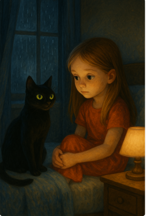 Однажды они наконец — то оставляют Нюту одну и тут же ей на кровать прыгает Чёрный Кот.