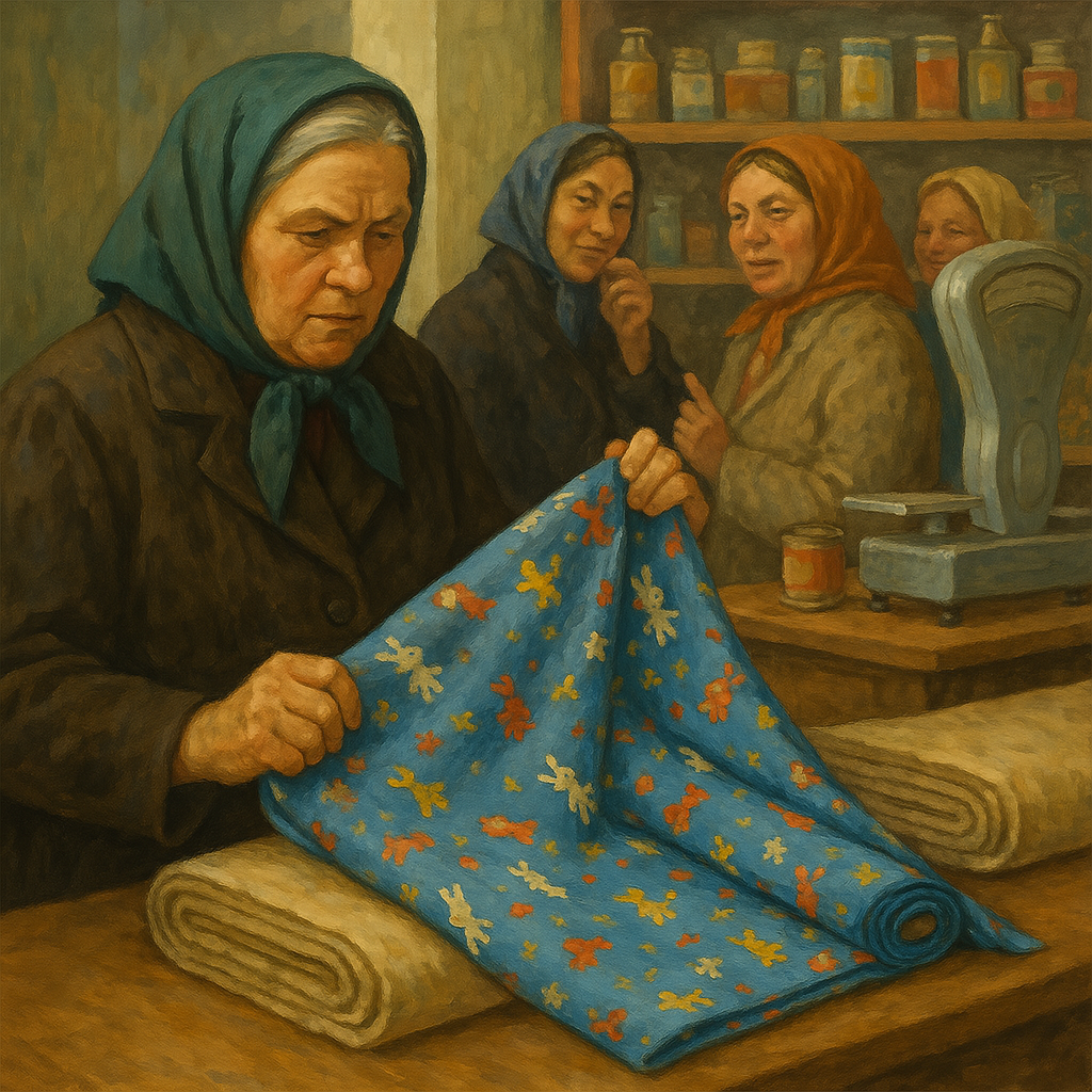 Продавец называет цену. Пожевав губами, Марья Антоновна берёт несколько метров.
