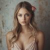 • Description: A Caucasian child, appearing to be between 4 to 6 years old. The child has a fair complexion, with a round face and slightly chubby cheeks. Their hair is light blonde, short, and somewhat tousled. The eyes are wide open, a striking blue or grey, looking upwards with an expression of apprehension, curiosity, or perhaps a touch of sadness. The child has a small nose and a slightly parted mouth.