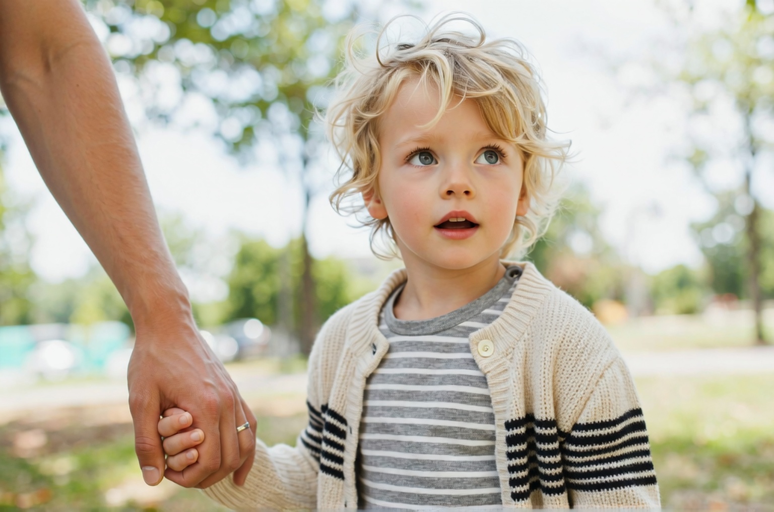 ? Wardrobe: The child is wearing a striped t-shirt underneath a knitted cardigan. The t-shirt has thin horizontal stripes in varying shades of grey and white. The cardigan is a light beige or cream color with thicker ribbed horizontal stripes in darker grey and thin black lines. The cardigan has a zipper down the front, which is partially open. The adult’s | Enhanced Prompt: A photorealistic medium shot, tightly framed on the upper body of a Caucasian child, appearing between 4 to 6 years old, positioned slightly off-center to the right. The child has a fair complexion, round face, light blonde tousled hair, and striking blue eyes looking upwards with an expression of apprehension and curiosity, their mouth slightly parted. The child wears a grey and white striped t-shirt underneath a light beige knitted cardigan with dark grey and black horizontal ribs and a partially open zipper. The left side of the frame is dominated by the sharply focused arm and hand of an adult, acting as a leading element towards the child. The scene is well-lit with controlled, bright daylight, suggesting a low ISO and sharp focus achieved with a 50mm to 85mm prime lens, resulting in a clean, digital clarity with minimal grain. A shallow depth of field (f/2.8 to f/4) creates a pleasing bokeh, isolating the child’s sharp features against a softly blurred background environment, emphasizing connection and reliance. SHOT: