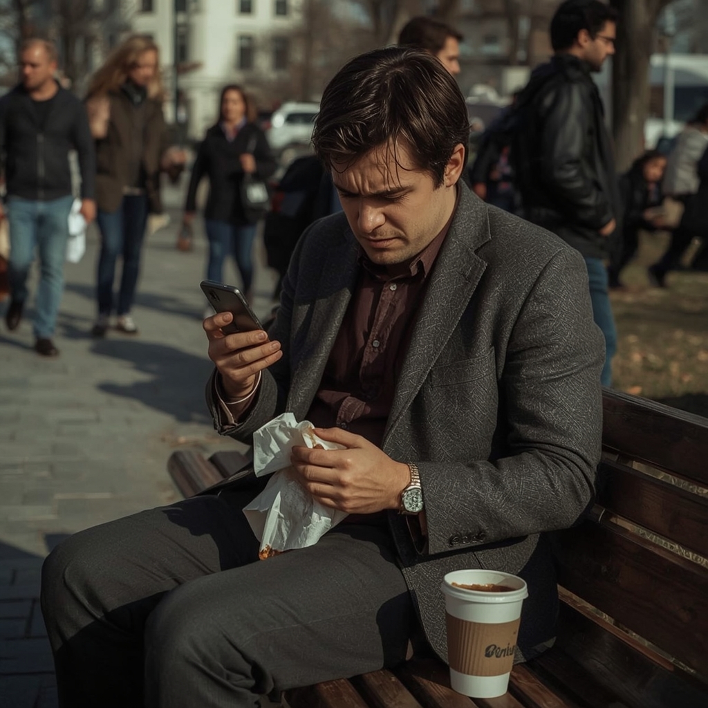 Обеденный перерыв. Арсений откинулся на спинку парковой скамейки, развертывая бумажную упаковку с сэндвичем. Надкусил — сырный соус уже пропитал хлеб, превратив его в мокрую массу. Он поморщился, но продолжал жевать, уставившись в экран телефона. Десять непрочитанных рабочих писем, три напоминания о неоплаченных счетах и бесконечный чат с коллегами, обсуждающими вчерашний проваленный проект. Он потянулся за стаканчиком кофе — напиток остыл, оставив на стенках горький коричневый налет.
