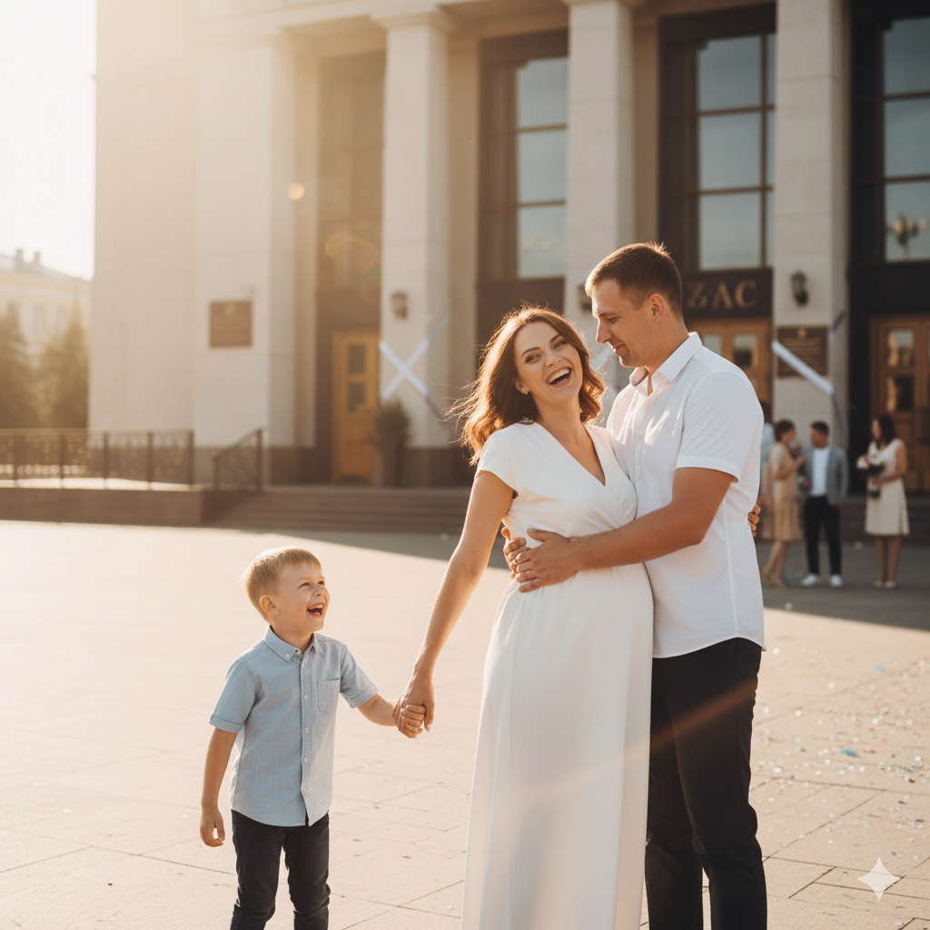 Счастливая пара выходила из ЗАГС – а, на их пальцах блестели обручальные кольца. Маленький Саша держал за руки папу и маму. Денис вышел из машины и направился в здание ЗАГС – а, чтобы подать заявление на развод с очередной пассией. В счастливой паре он узнал свою бывшую жену, они прошли мимо и даже не посмотрели на него. Только сейчас он понял, как много он потерял, и что он никогда не сможет вернуть жену и сына обратно. Казалось, что за то время, что он прожил без Евгении он многое понял, он больше не кичился своим положением, а с тоской наблюдал, как счастливые молодожёны садились в автомобиль. Свадебный кортеж уехал, а он всё также стоял на ступеньках и чуть слышно шептал.