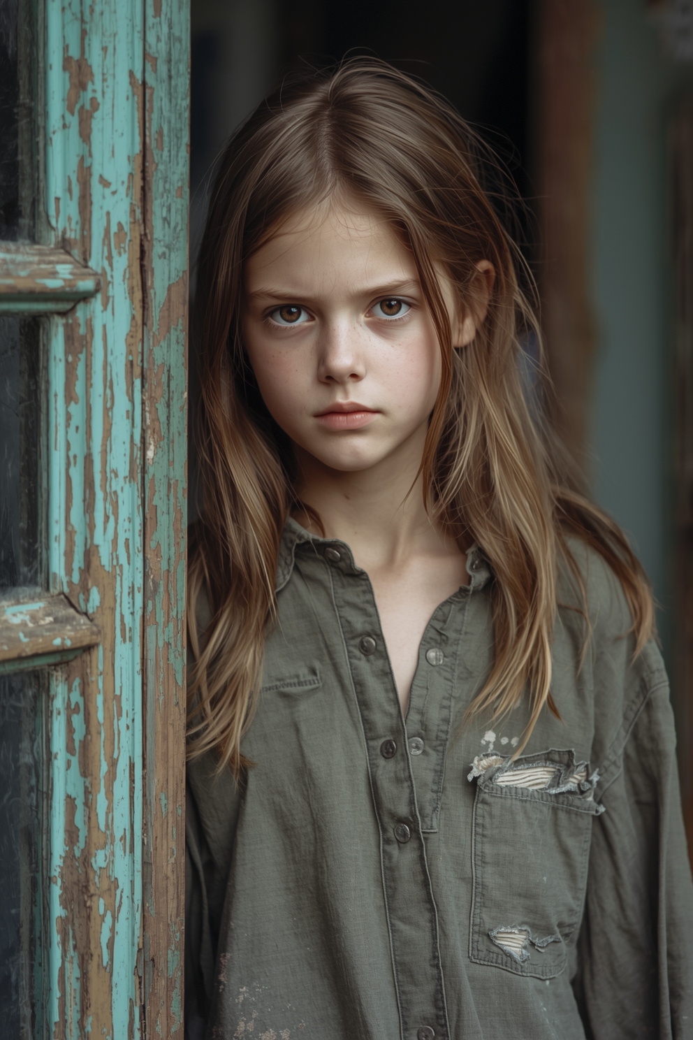 Участковый Валерий, обходя привычный маршрут, заметил этот приглушённый стук. Он невольно поднял голову. В окне второго этажа стояла девочка — лицо бледное, глаза испуганные, волосы спутанные, как у куклы, которой не играли уже несколько лет. Она стучала ладошками по грязному, почти мутному стеклу. Валерий остановился, почувствовав, как внутри что-то сжимается. Он взглянул на её оборванную одежду — футболка, которая висела, будто была с чужого плеча, и слишком большие штаны, державшиеся чуть ли не на одной верёвочке вместо пояса.