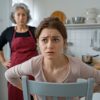 • Composition: Medium shot, framing the upper bodies of a man and a woman. The woman is positioned slightly forward and to the right of the man, occupying the right two-thirds of the frame. The man is to her left and slightly behind. The composition is slightly off-center, with the subjects’ gaze directed upwards and out of frame to the left, creating a sense of shared concern or confusion. The background is a domestic kitchen, with shelves and appliances providing a sense of depth but not strong leading lines.