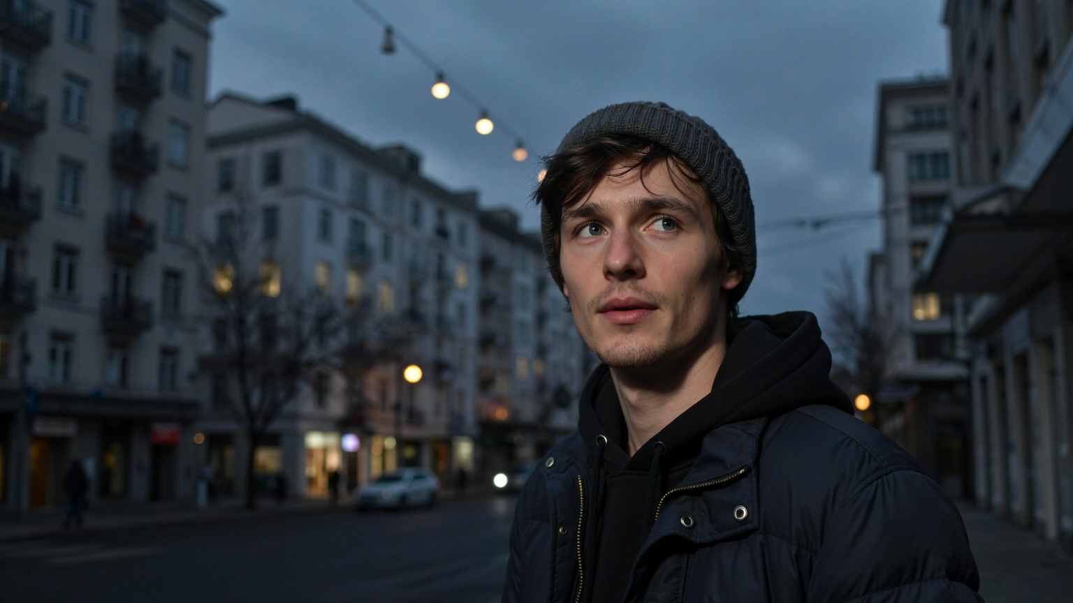 ? Wardrobe: He is wearing a dark grey or black knitted beanie pulled down over his ears. Beneath the beanie, he has a dark hooded sweatshirt, visible at the neckline. Over the hoodie, he wears a dark, padded winter jacket, possibly black or dark grey, with a visible zipper and pockets. The jacket appears to be made of a durable, possibly water-resistant material. There are visible | Enhanced Prompt: A medium shot portrait of a young adult male in his early twenties, featuring a fair, slightly rugged complexion, angular features, and a strong jawline, wearing a dark grey knitted beanie pulled over his slightly messy dark brown hair. He has a neutral, pensive expression, looking upwards and slightly to the left. He is dressed in a dark hooded sweatshirt layered under a dark, padded winter jacket with visible zippers. The scene is an urban environment at dusk under dim, overcast lighting, with the subject positioned slightly off-center to the right, adhering to the rule of thirds. Leading lines are formed by the rows of illuminated windows and a string of overhead lights, drawing the eye towards him. The background features softly blurred city buildings creating depth, with creamy, indistinct bokeh. Visible but subtle film grain adds a slightly gritty texture. The aesthetic is enhanced by a moderate depth of field, sharp focus on the subject, and a slight softness towards the frame edges. Photorealistic, high contrast lighting. SHOT: